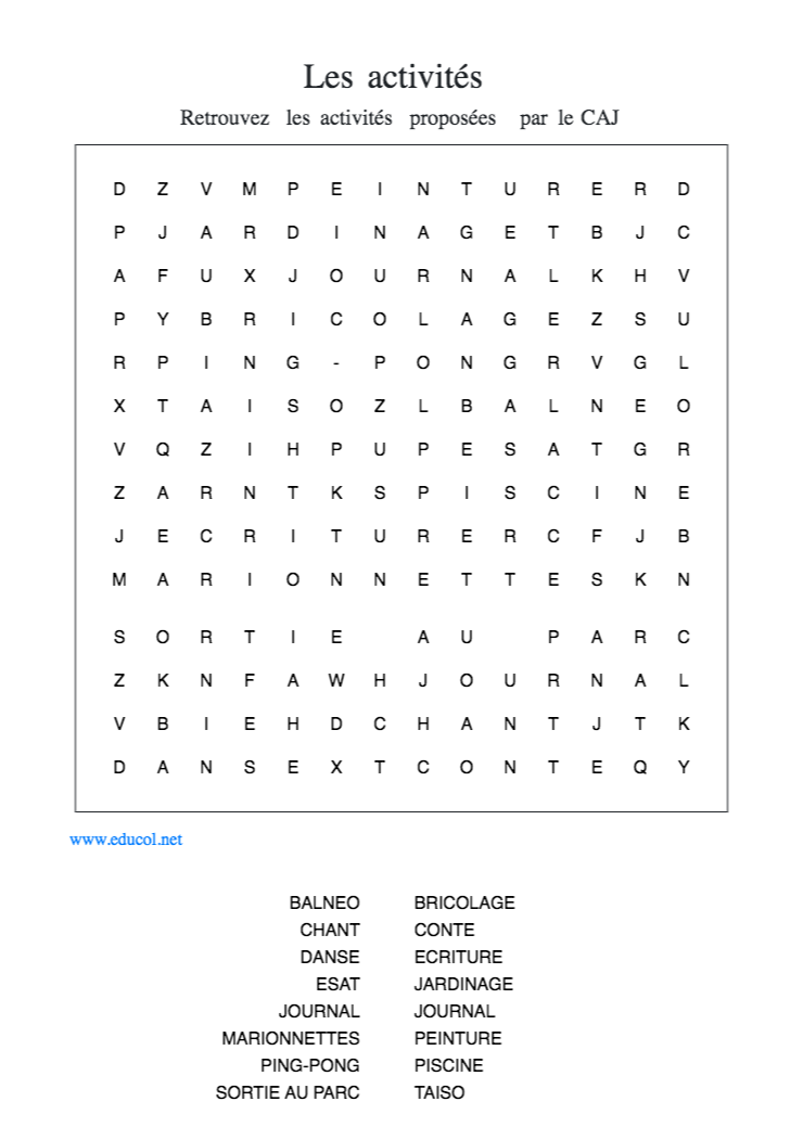 Ces mots correspondent aux activités qui étaient proposées au CAJ avant le confinement.
